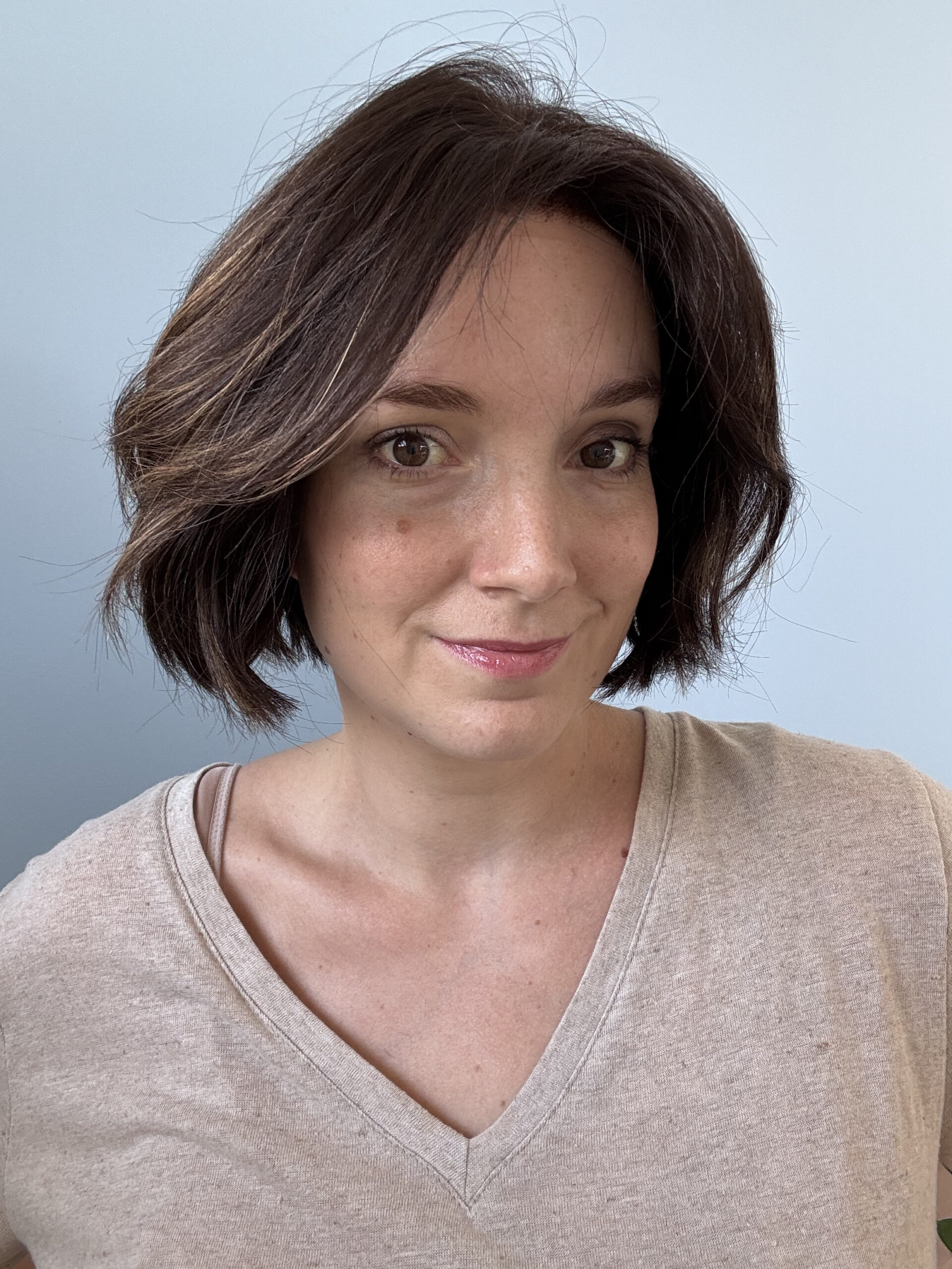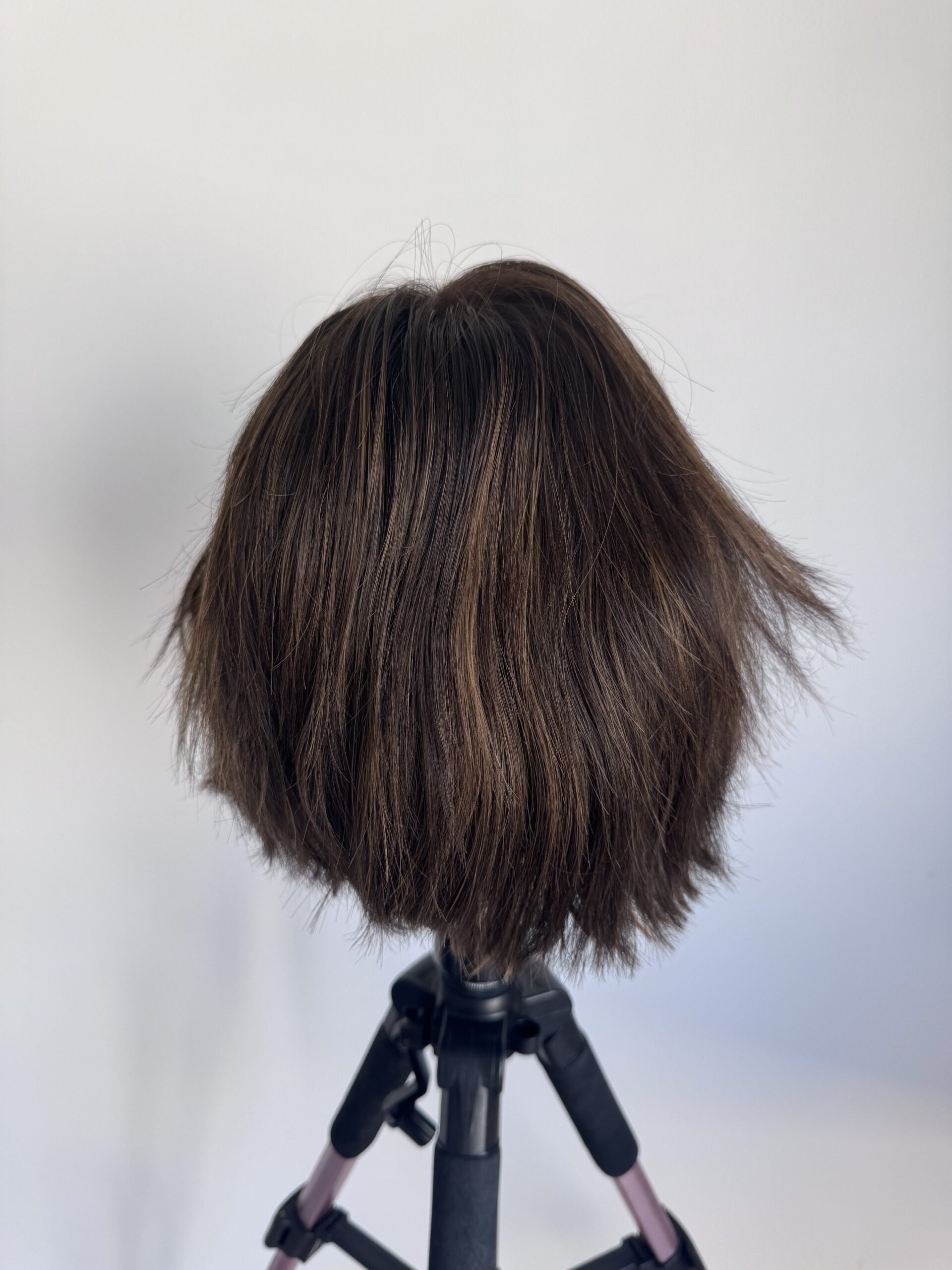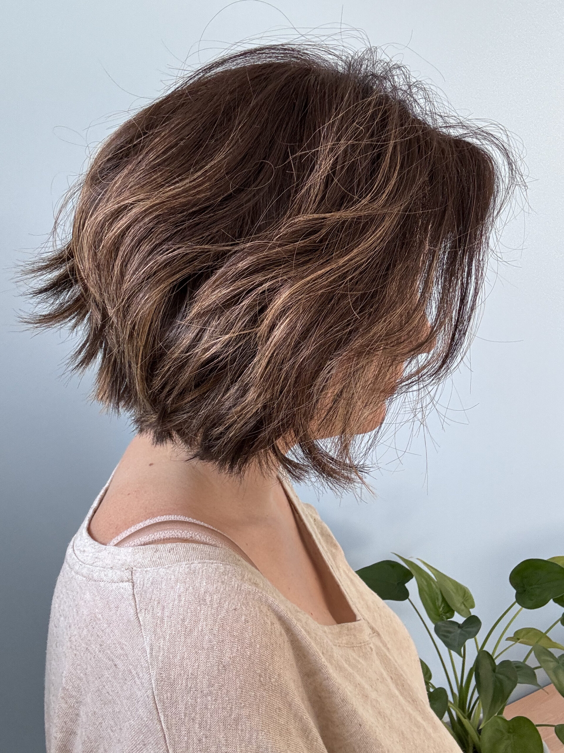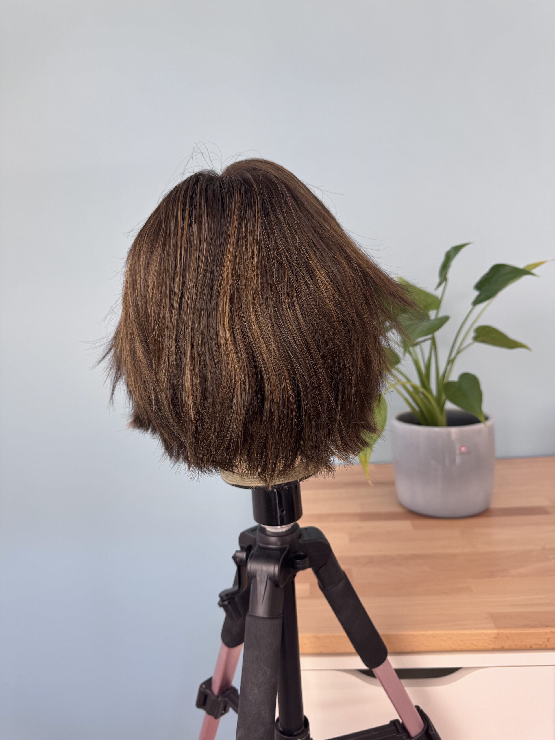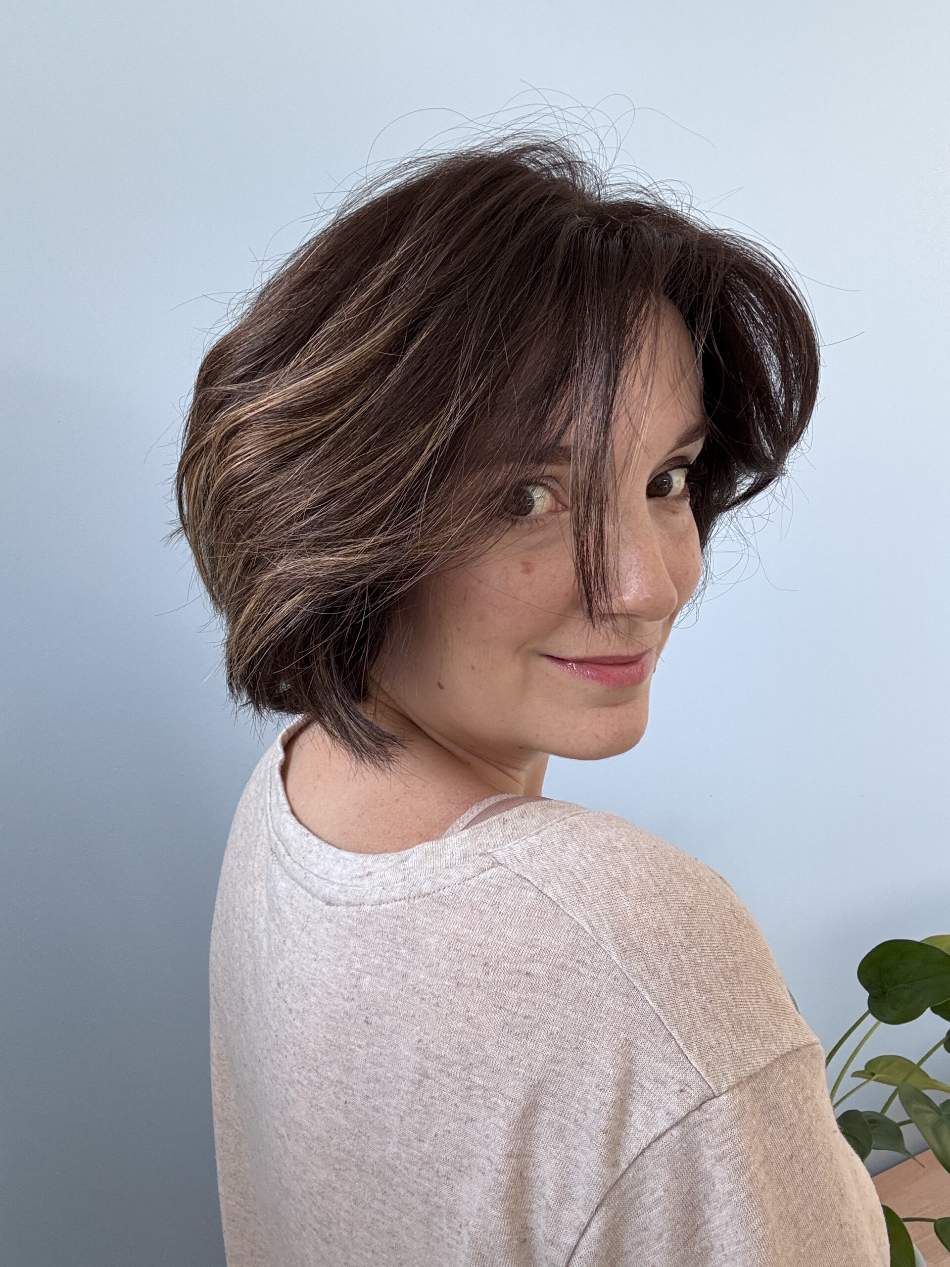 Sa coupe courte ultra-moderne et sa teinte Katie, un châtain foncé profond réchauffé de légers reflets miel, apporte une douceur lumineuse à la chevelure tout en conservant la richesse et l’intensité du brun. Cette nuance subtile illumine le visage et s’harmonise parfaitement avec les carnations claires à mates.