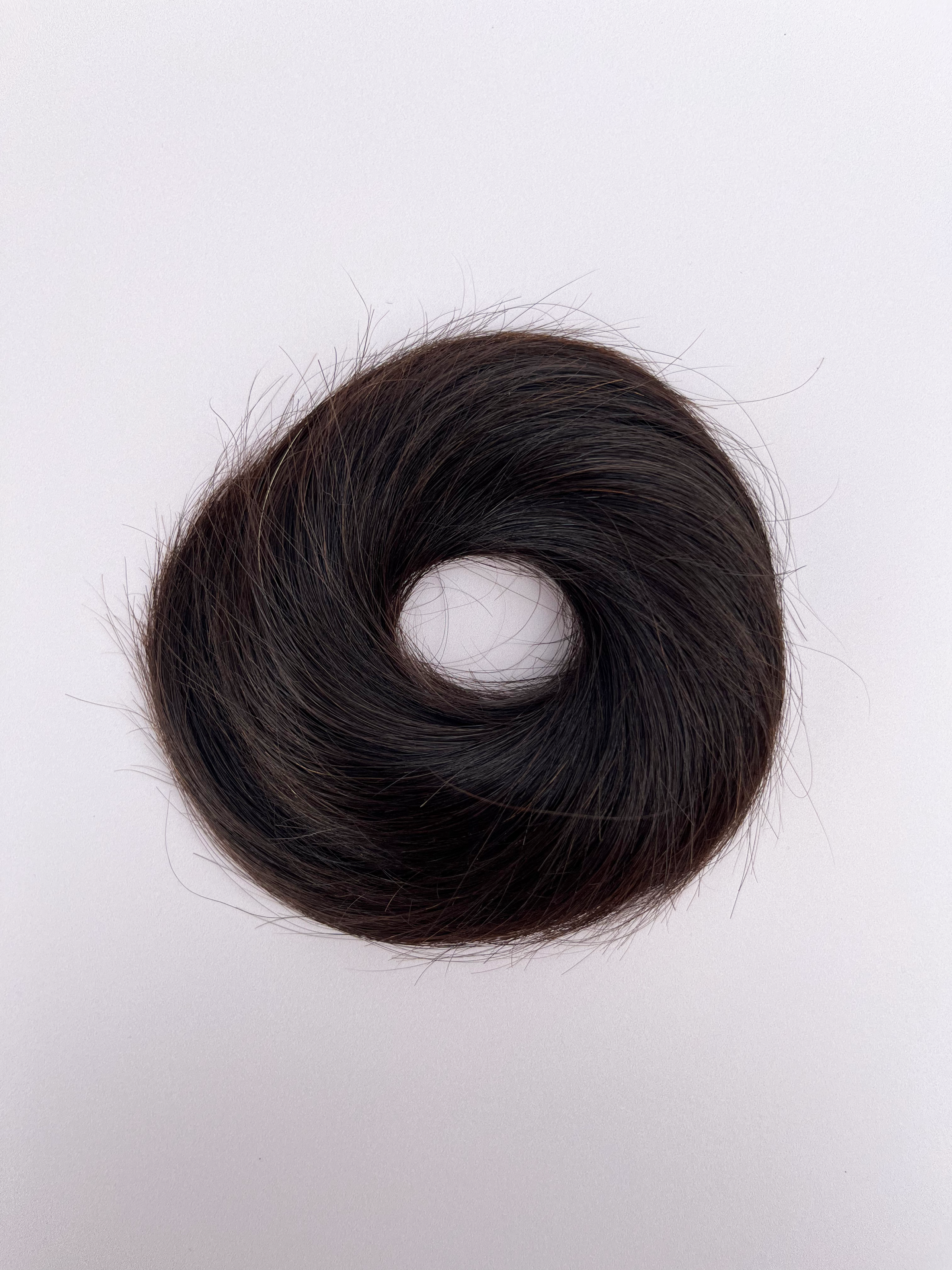 Un accessoire vraiment extra pour un effet splendide ! Adieu petit chignon moche et place à une belle choucroute, pas trop grosse justement pour un effet très naturel ! Effectivement nous avons la masse capillaire peu épaisse, donc ce donut se fond parfaitement avec notre “type” de cheveux. On peut choisir un effet décoiffé ou le resserrer avec des pinces à chignons pour bien l’arrimer. Le plus de cet accessoire est bien sûr que ce sont de vrais cheveux, donc invisibilité totale ! Pour cacher les trous du crâne, je complète par une peu de poudre densifiante et le tour est joué ! A consommer sans hésitation dans le choix de votre ton !!