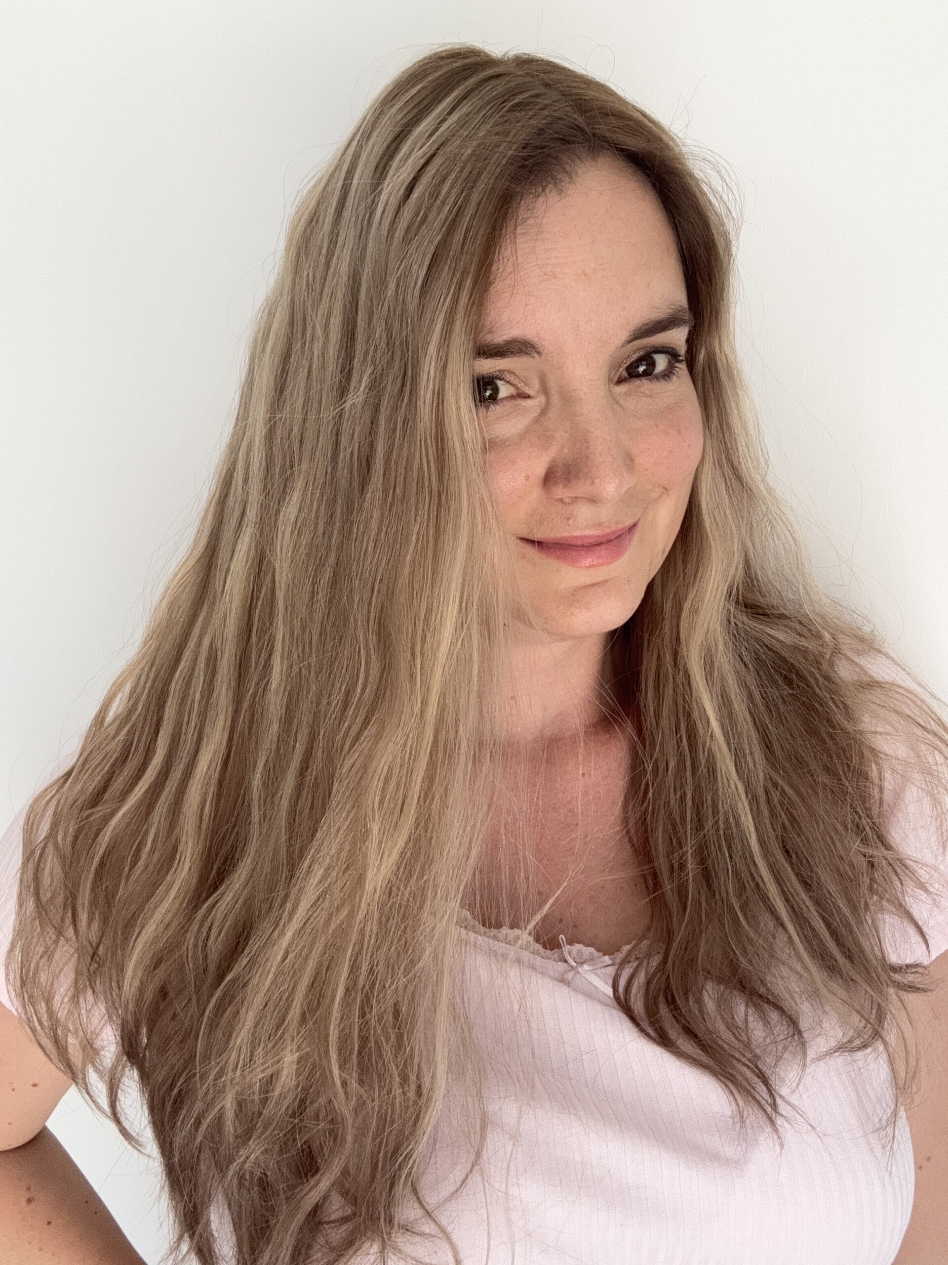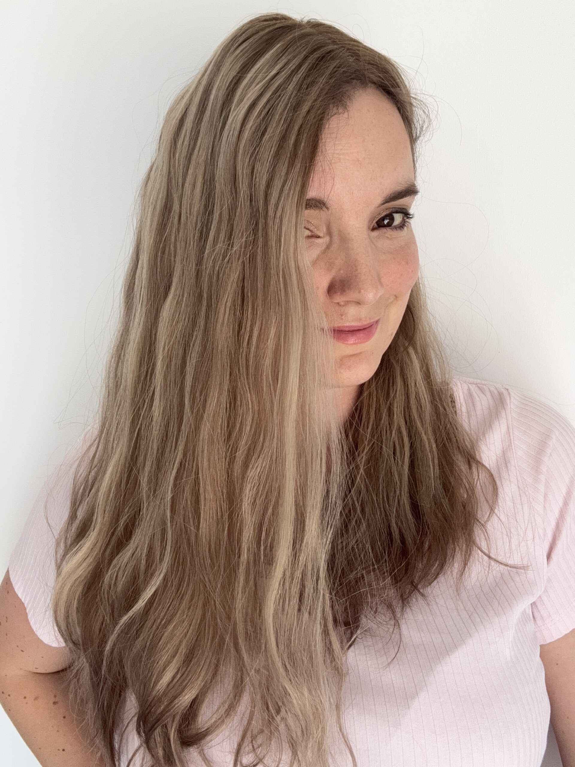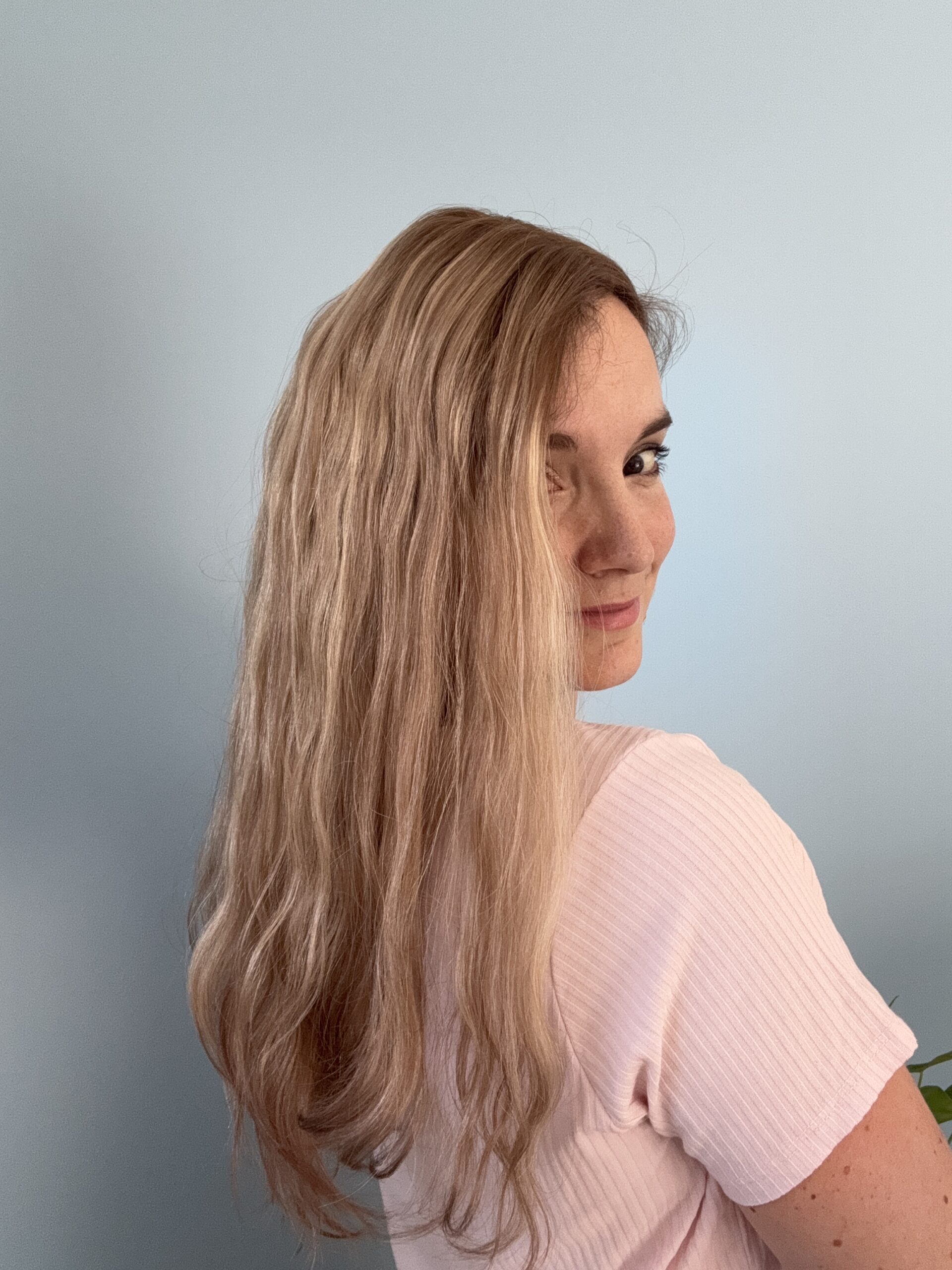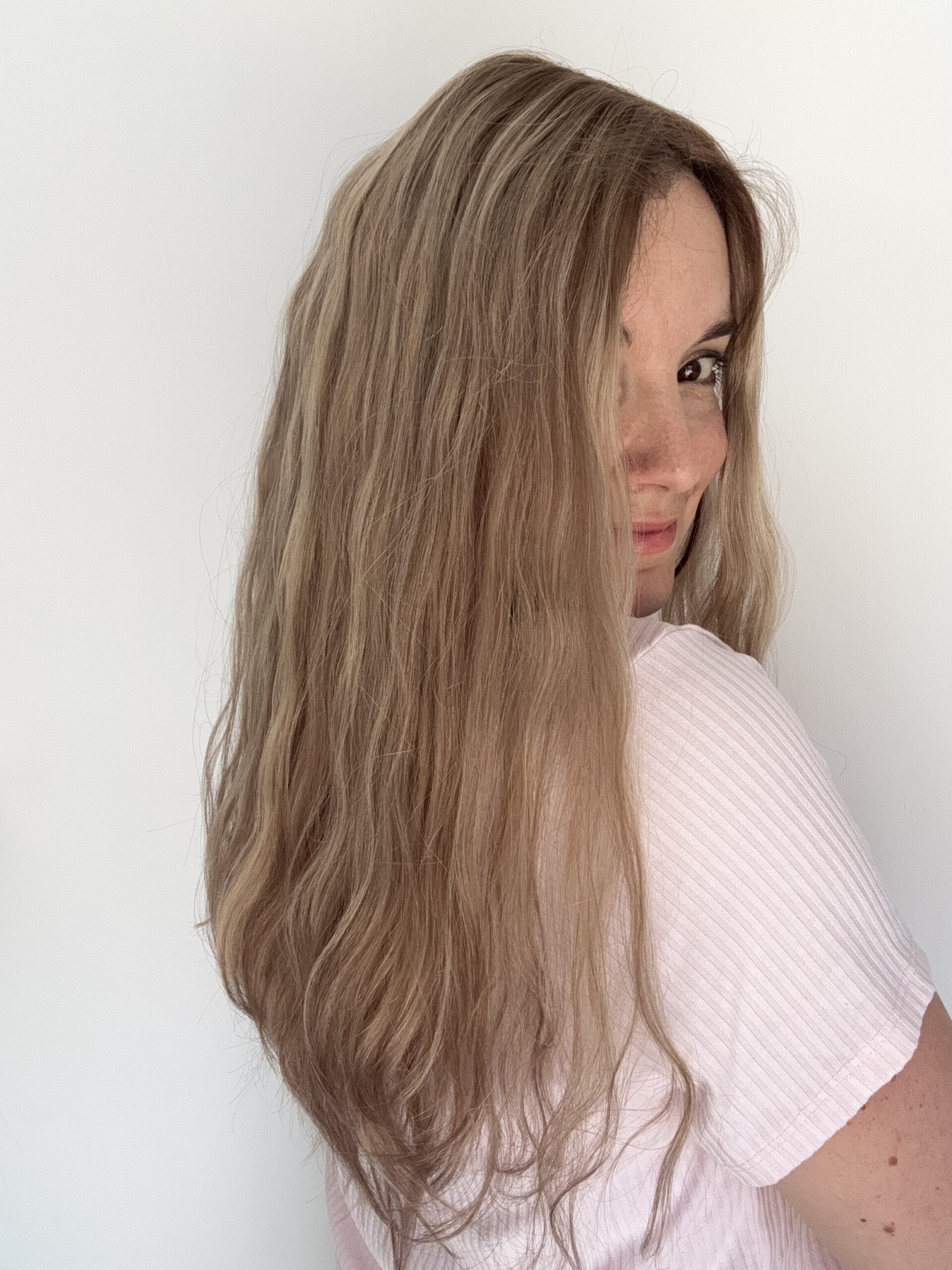 Son blond doré chaud illuminé de fines mèches blond clair recrée à la perfection l’effet d’un balayage en salon, sans démarcation visible sur le cuir chevelu.