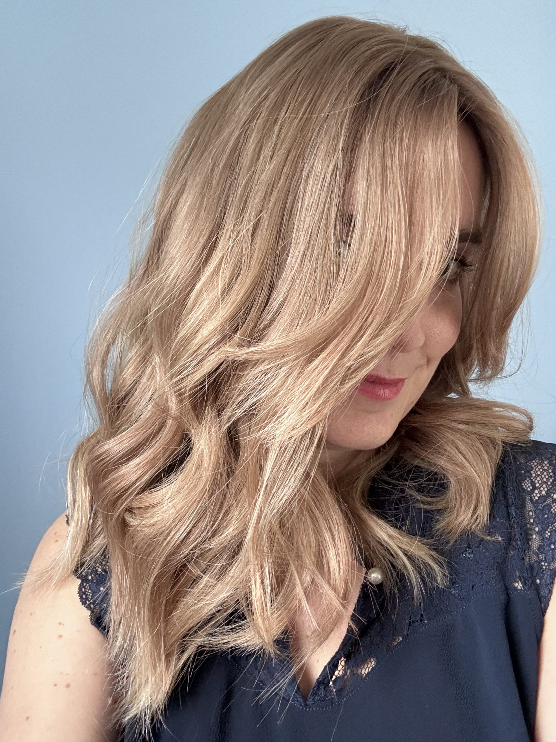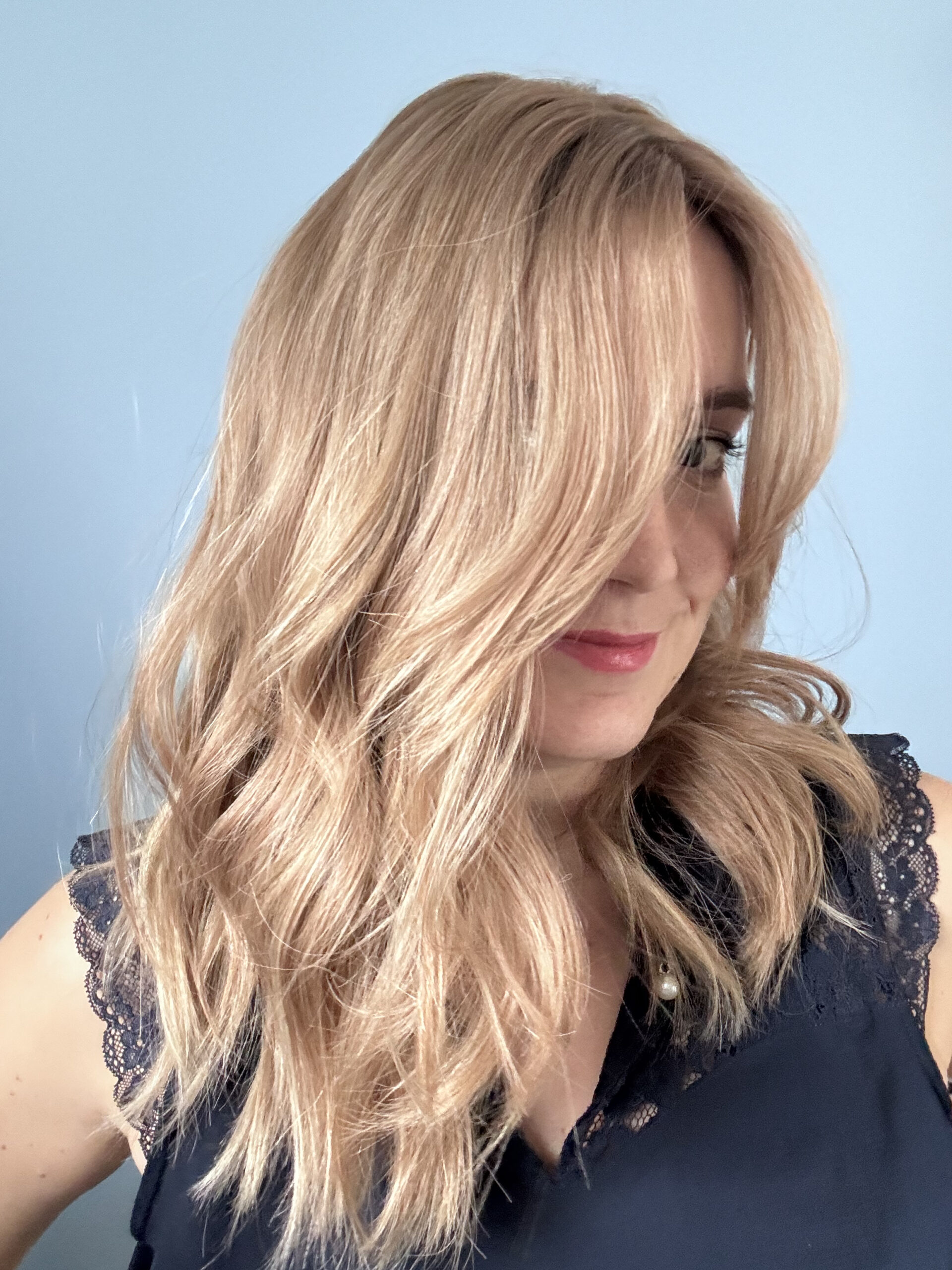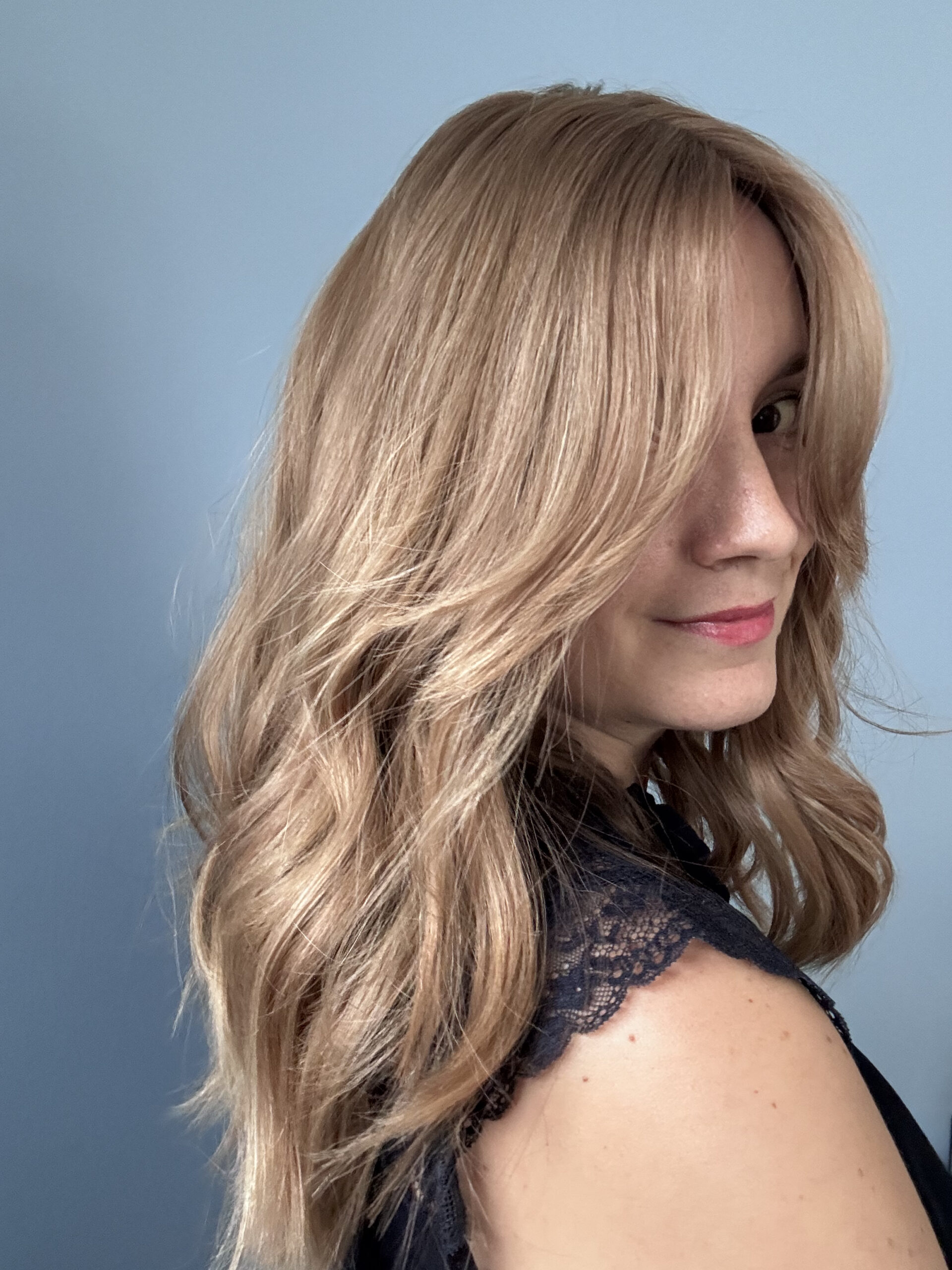 Ce modèle a une frange rideau longue et une coupe diadème.